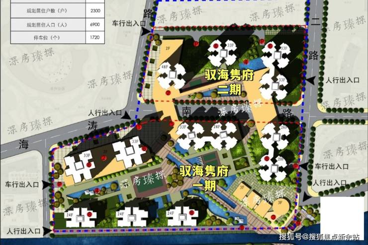 驭海隽府,由隽越投资集团打造,其前身是海涛花园城市更新单元,总占地面积约4.43万㎡,总计容建筑面积约26.3万㎡,共分南北2期开发,由13栋住宅组成,总规划2300户,停车位1720个(这是前期规划,后期有所调整,待更新数据),其中住宅223780㎡(含保障性住房17900㎡),商业12600㎡。