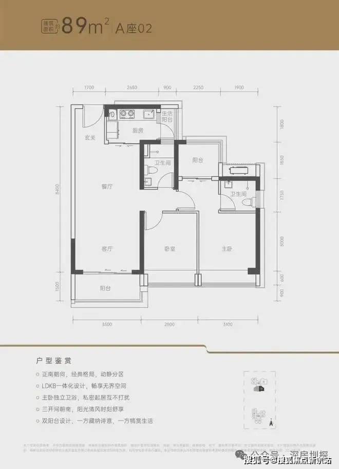 三开间正南朝向;LDKB一体化设计;动静分区。