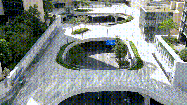 二层连廊将原本割裂的商业、公园打通,同时人车分行,整体空间更加舒适、安全。