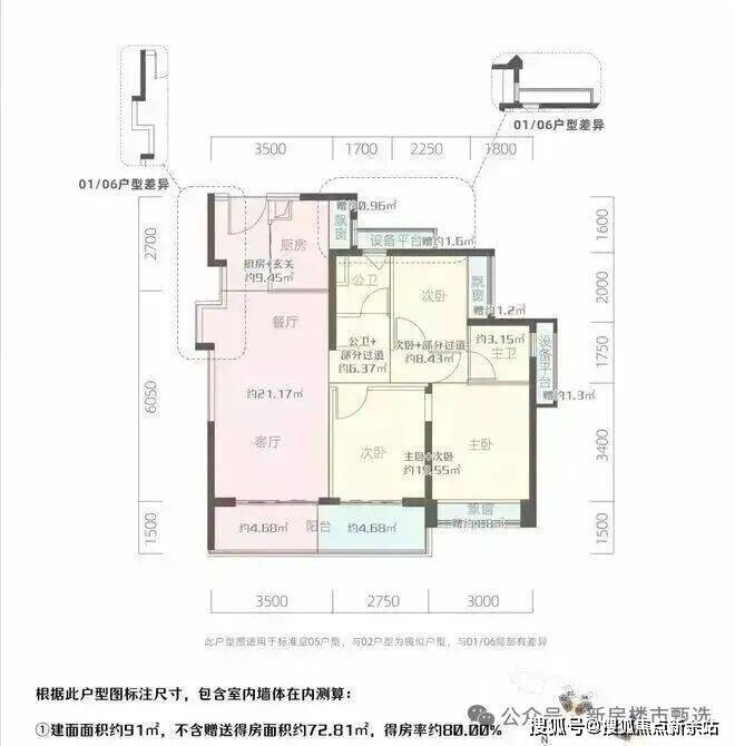 91㎡的3房2厅2卫,设计的是经典竖厅格局,客厅3.5米开间,三开间朝南,3个卧室分别是3米/2.75米/2.25米的宽度,U型厨房,公卫三段式分离设计,得房率:92.69%(包含赠送),阳台西北或东北朝向。