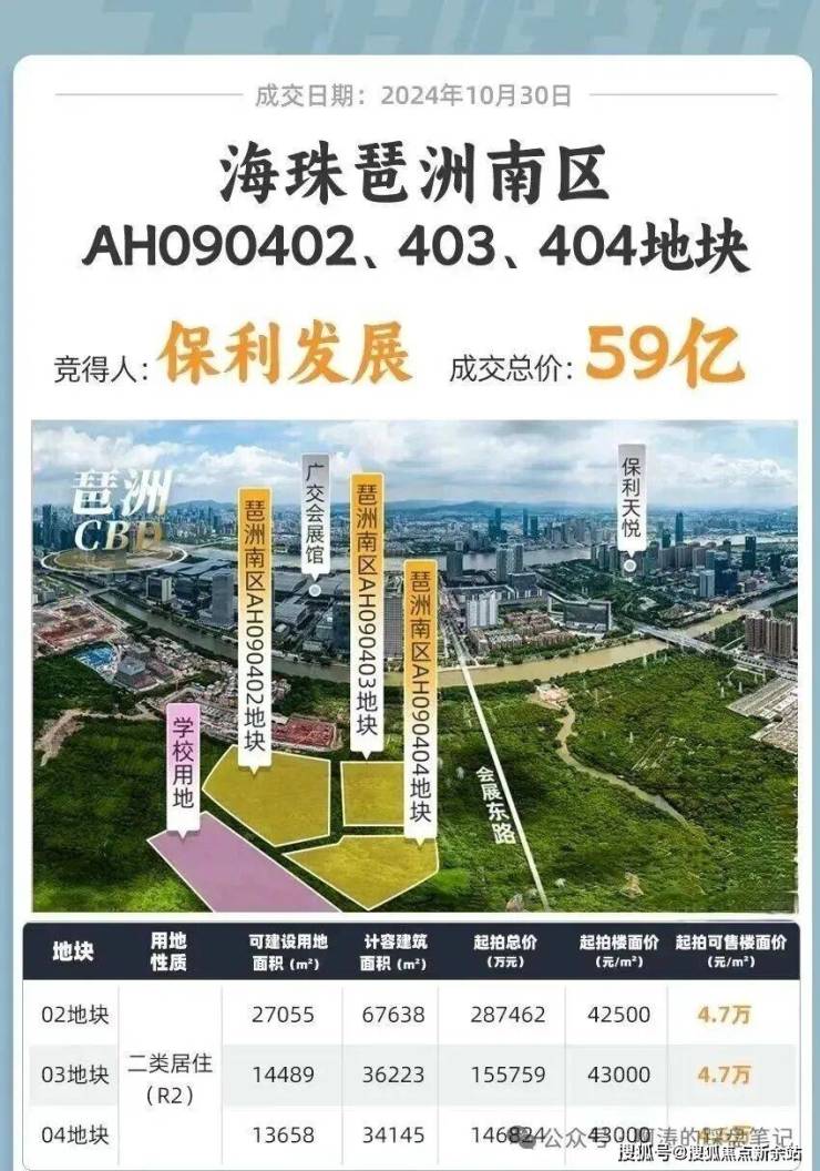 2024年10月30日,保利发展,付出了59亿+的总价,拿下了广州“压箱底”靓地——琶洲南三兄弟(AH090402号、03号、04号地块)。