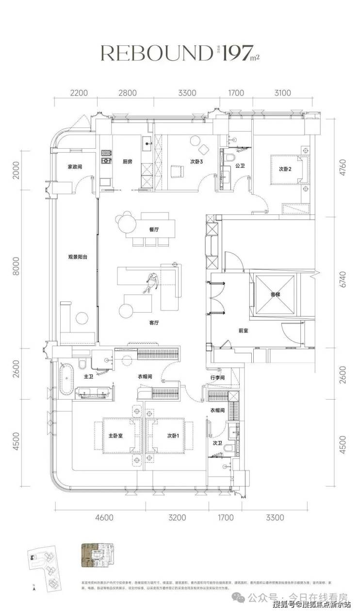 以 197㎡四房三卫户型为例,采用板式结构,南北通透,通风和采光条件绝佳。四开间朝南,客餐厅一体化设计,面宽达 7.8 米,连接约 9.5 米景观阳台,无论是清晨的第一缕阳光,还是傍晚的落日余晖,都能尽情享受。主卧套房配备 270° 转角飘窗和独立衣帽间、双台盆卫浴及浴缸,面积达 35㎡,尊享全景仓视野,为您打造极致的居住体验 。