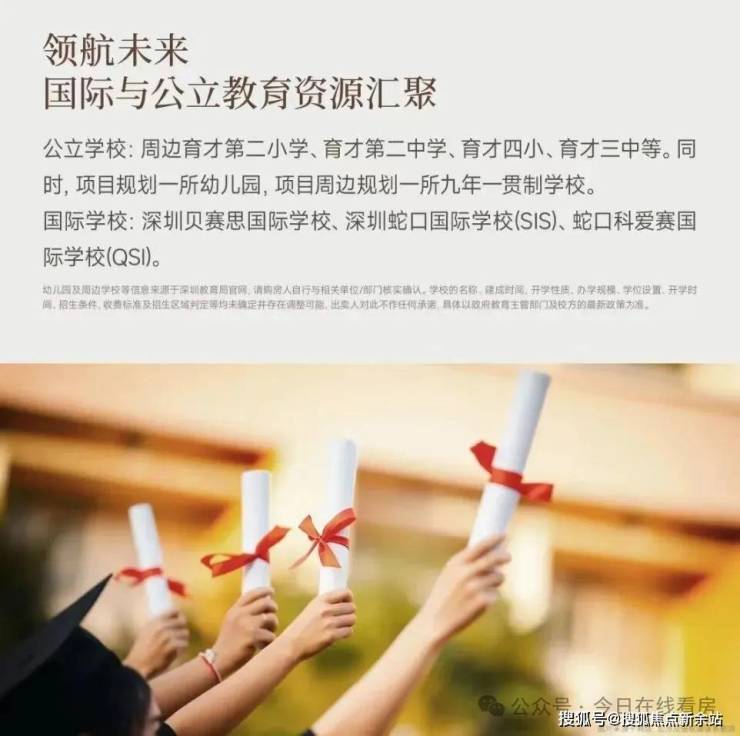 :当前对口的育才二小和育才二中,均属南山第一梯队学区,教育质量有口皆碑。项目自身还配建了一所幼儿园和一所九年一贯制学校,未来孩子在家门口就能享受到优质的教育资源,为孩子的成长成才奠定坚实基础 。