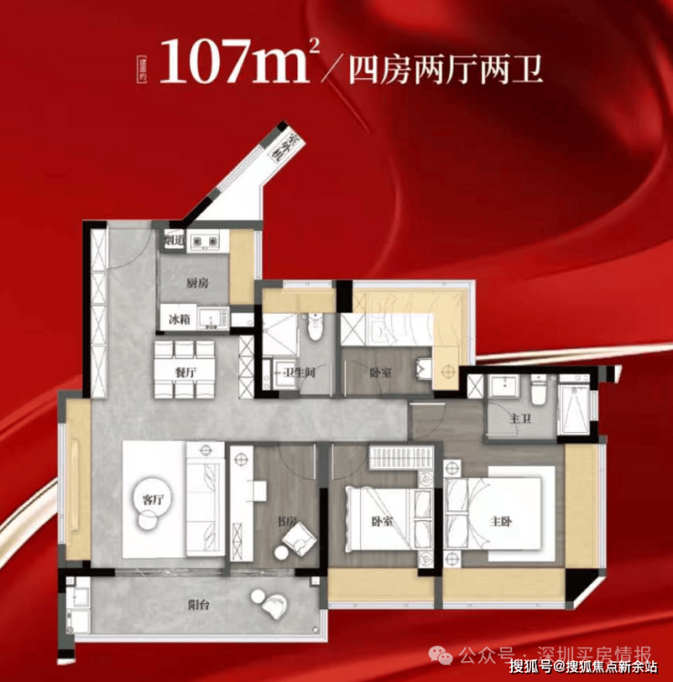 110㎡的4房2厅2卫,设计的是横厅南北通透格局,进门入户玄关,客餐厅6米开间,LDKB一体化,4个卧室分别做到了4.1米/3米/2.5米/2.4米的宽度,主卧套房设计,客厅连接次卧出6.7米长的大阳台,L型厨房,卫生间干湿分离,阳台主朝西南向。