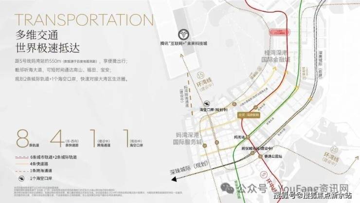 【交通】立体便捷交通,更便捷高效出行距5号线妈湾站约550m,毗邻听海大道,可快速通达南山、福田、宝安及大湾区生活圈;规划8条轨道(城际+城市)、4条快速路、1条跨海通道(建设中)1个海空口岸(规划中)。