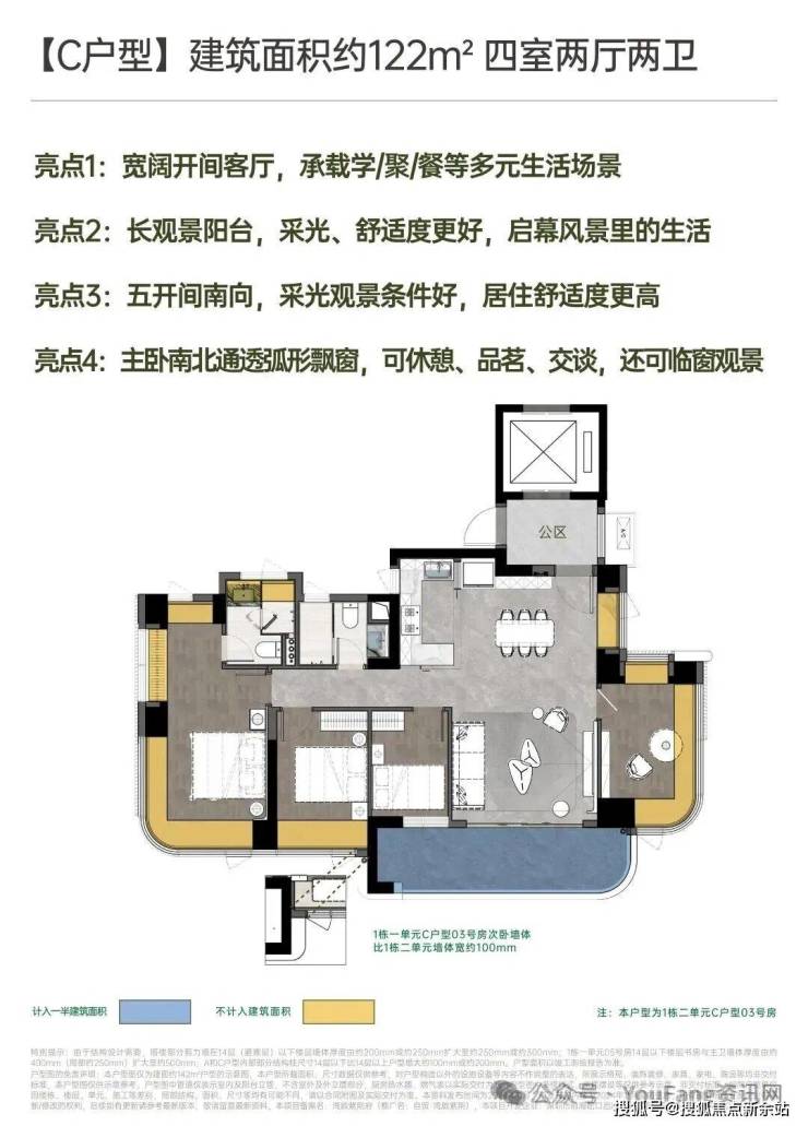 项目共规划主力为3-4房产品:建面约142㎡南北方厅 阔景四房;