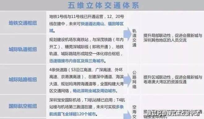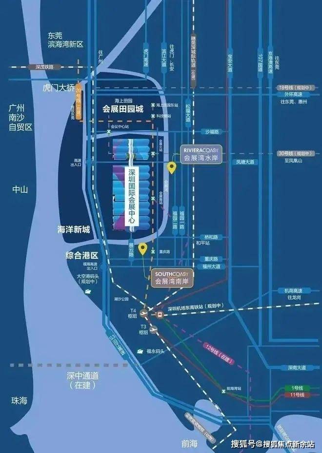 城市陆路枢组:S3沿江高速、广深公路、京港澳高速等核心路网迅速通达南山、福田,深中通道(在建)、妈湾跨海通道(在建)、滨江大道、展览大道。