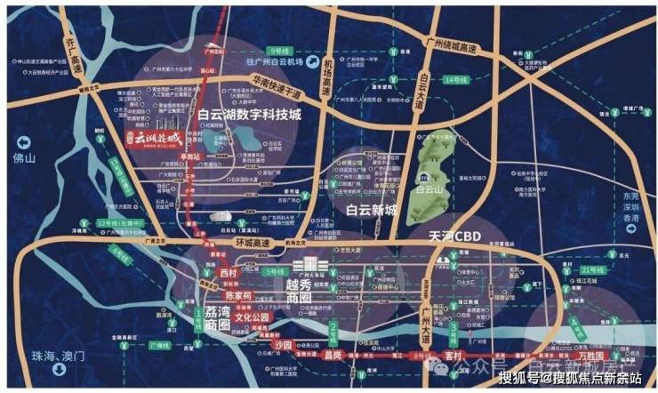 项目3公里范围内可接驳华快-朝阳站、许广-庆丰站,双高速贯通广州五大城区(越秀、荔湾、海珠、天河、花都)