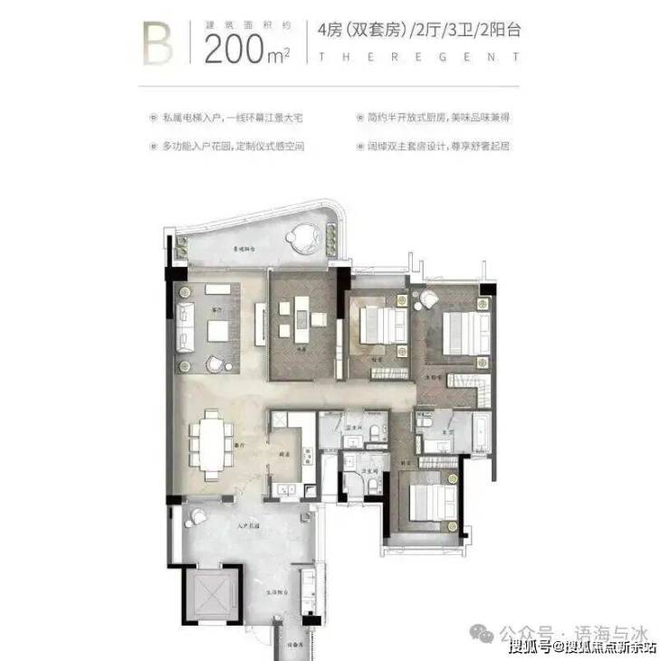 『天启』组团面积约140-250㎡环幕临江大平层,坐拥江景第一排,眺望小蛮腰,享500米宽阔无遮挡江景视野,并邀请三大全球知名设计大师倾力打造,并配备12大国际一线品牌交标,专梯专户四房双套房设计,世界灵感前沿作品礼献广州!