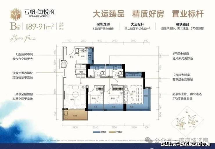 89㎡3房2厅2卫:设计的是经典横厅格局,LDKB一体化,进门入户玄关,客厅带3.5米阳台,U型厨房,主卧南北通透270度景观,卫生间干湿分离。