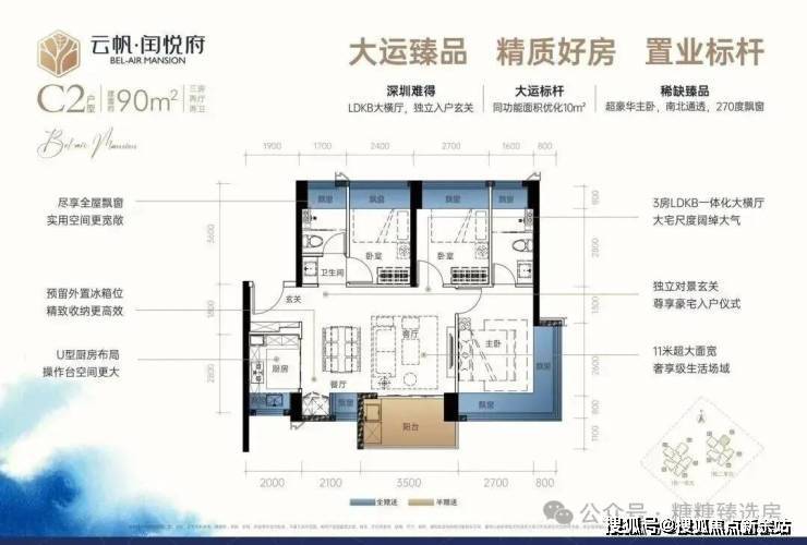 90㎡3房2厅2卫:设计的是经典横厅格局,LDKB一体化,进门入户玄关,客厅带3.5米阳台,U型厨房,主卧南北通透270度景观,卫生间干湿分离。