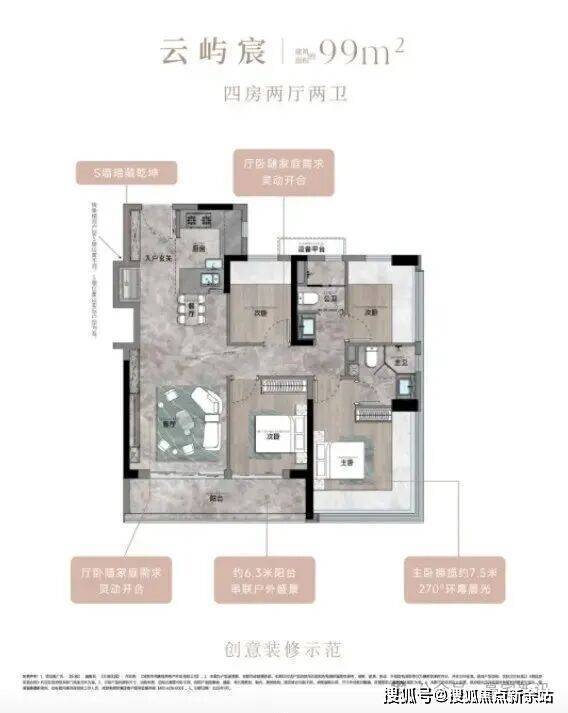 99㎡的4房2厅2卫,设计的是竖厅格局,客厅3.35米开间,LDKB一体化,S墙设计预留双开门冰箱卡槽位,三开间朝南,动静分区,分别做到了主卧15.26㎡/次卧9.57㎡/次卧6.96m²/次卧6.96㎡(包含墙体飘窗),U型厨房,公卫三段式干湿分离,赠送设备平台,得房率约78.27%(不含赠送),客厅连接次卧出9.37m²大阳台西南或东南朝向。靓点:99平做到了4房2卫,主卧270°无柱转角飘窗,厨房烟道外置+额外赠送设备平台,并且是纯南向格局。