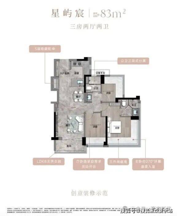 83㎡的3房2厅2卫,设计的是经典竖厅格局,客厅3.35米开间,LDKB一体化,S墙设计预留双开门冰箱卡槽位,三开间朝南,动静分区,分别做到了主卧16.02㎡/次卧9.08㎡/次卧7.01㎡(包含墙体飘窗),U型厨房,公卫三段式干湿分离,赠送1.98平设备平台,得房率约77.15%(不含赠送),阳台5.02m²西南或东南朝向。靓点:83平做到了3房2卫,主卧270°无柱转角飘窗,厨房烟道外置+额外赠送设备平台,并且是纯南向格局。
