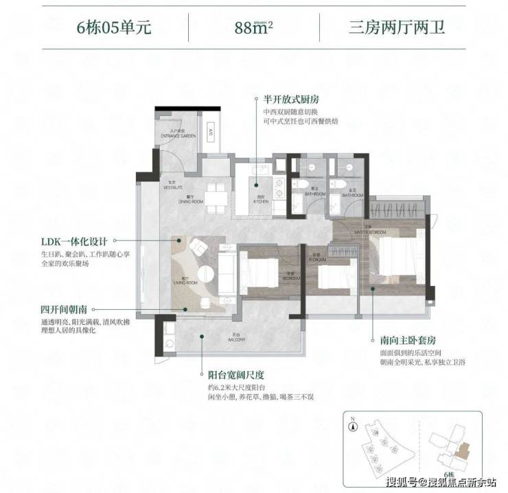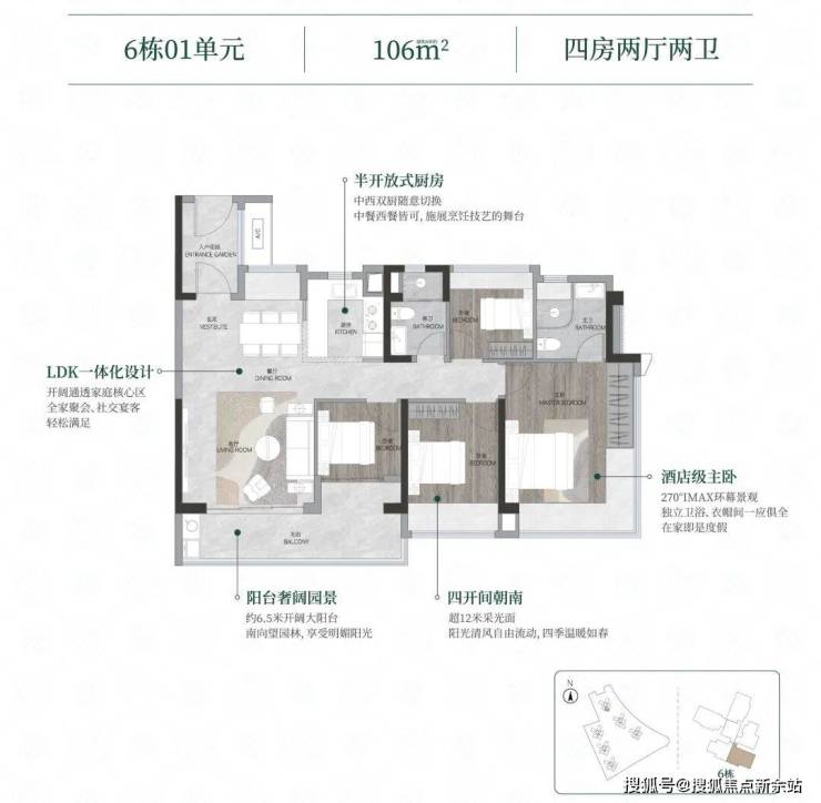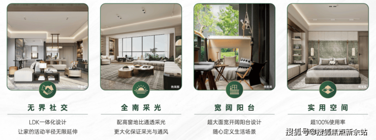 整个社区围合式布局,采用风车形楼型,取消北向户型,全南向排布,同等面积,朝向更佳;基本实现四开间以上,保证两个以上卧室南向,比同等南向产品品质感更强。