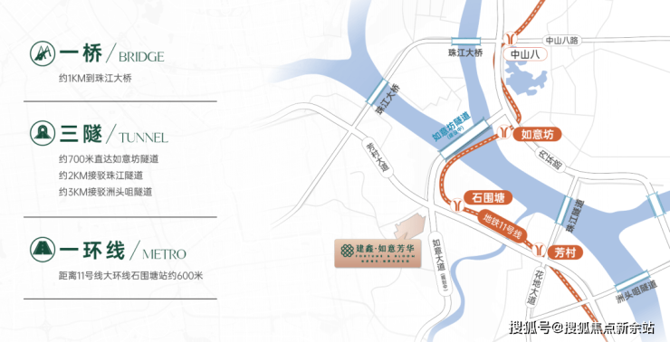 居于广州主城核芯区,自然执掌四方通衢。建鑫·如意芳华坐拥“一桥三隧一环线”立体交通,距地铁11号线石围塘站D出口约600米,一线换乘多线;如意坊隧道(预计2025年底开通)距项目约700米,开通后快速畅达内环路;同时便捷接驳珠江隧道、洲头咀隧道与珠江大桥,从容掌控主城节奏。(上述测距来源:高德地图)