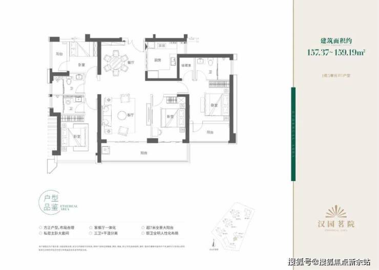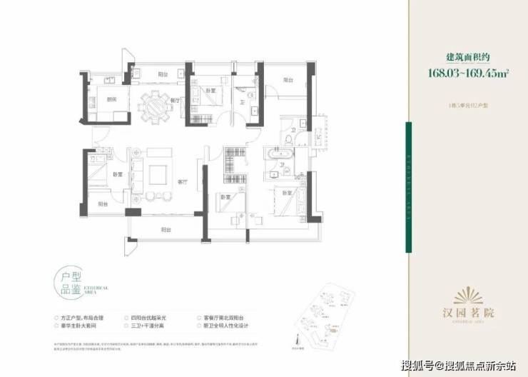 目户型方正、布局合理,动静分区,其中168㎡五房户型为四阳台设计,客餐厅南北通透双阳台,豪华主卧大套房。