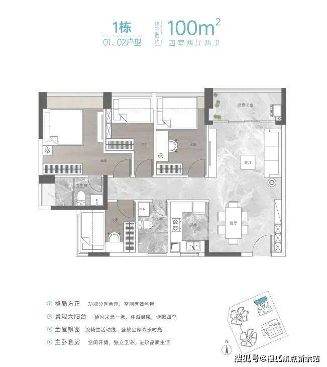 ⑦:建面约100㎡是四房两厅两卫户型,结构方正,功能间的布局也比较合理,动静分区、实用性比较强,唯一明显槽点是西北朝向。