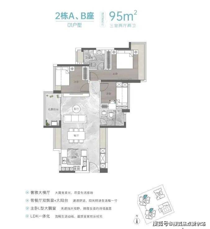 ⑥:建面约95㎡是横厅三房两厅两卫户型,结构没那么规整,优点在于它是横厅,单看户型图客厅是通透的,实则是伪通透,阳台的另外一侧对着的是两条腿之间的廊道,进光亮和通风性能比较局限。