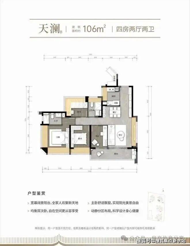 107㎡的4房2厅2卫,竖厅格局,客厅4米开间,LDKB一体化,S墙设计预留冰箱卡槽位,动静分区,U型厨房,卫生间干湿分离。客厅连接次卧出10.24m²观景大阳台东南朝向,得房率约79.1%(不含赠送),加上赠送面积后得房率100.51%。