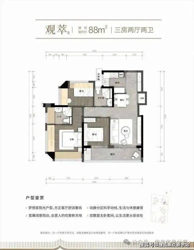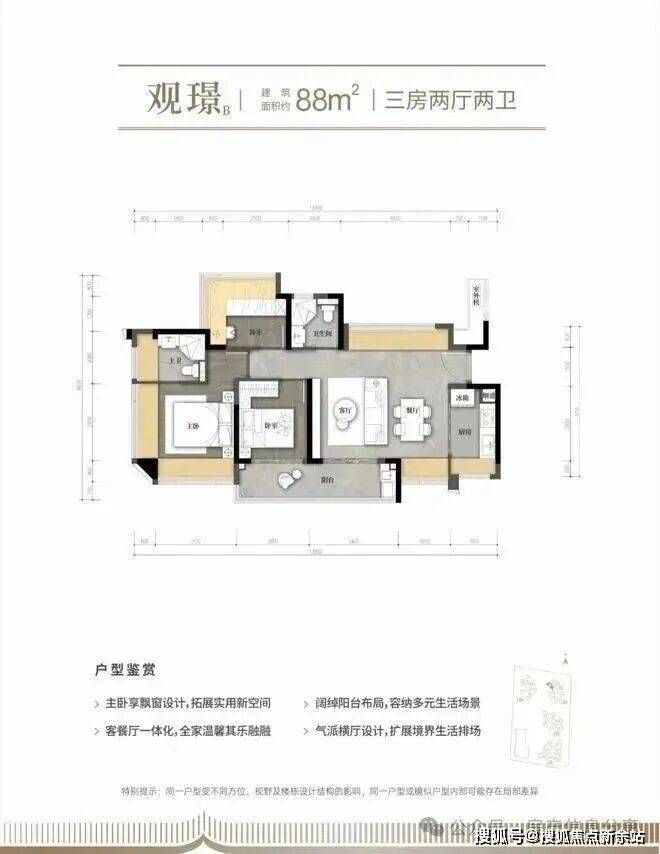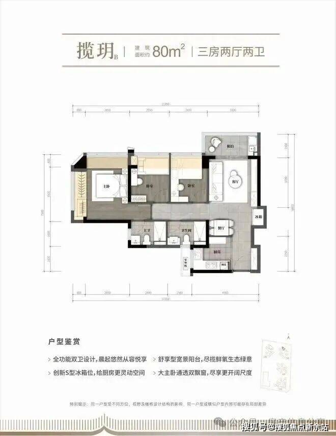 建面80㎡的3房2厅2卫,竖厅格局,客厅3.3米开间,LDKB一体化,S墙设计预留冰箱卡槽位,动静分区,U型厨房,卫生间干湿分离。阳台4.95m²东北朝向,得房率约79.1%(不含赠送),加上赠送面积后得房率94%。