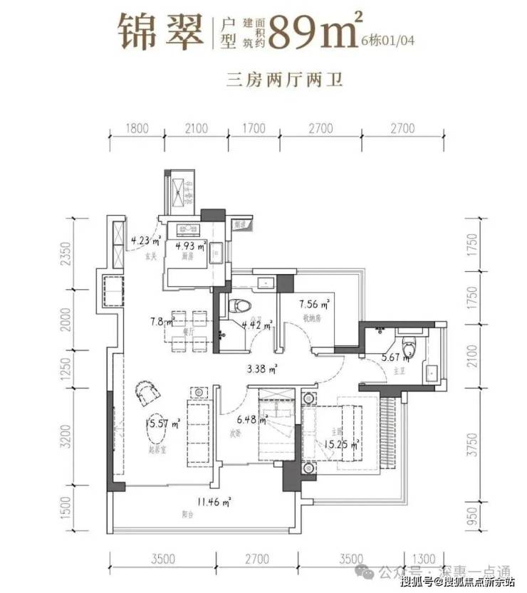 89㎡的3房2厅2卫,6栋01/04户型,设计的是经典竖厅格局,客厅3.5米开间,LDKB一体化,S墙设计预留冰箱卡槽位,三开间朝南,动静分区,主卧+次卧270°无柱转角飘窗,分别做到了主卧15.25㎡/次卧7.56㎡/次卧6.48㎡(包含墙体飘窗),U型厨房烟道外置,卫生间干湿分离,得房率约97.47%(包含赠送),客厅连接次卧出大阳台约11.46平,西南或东南朝向。