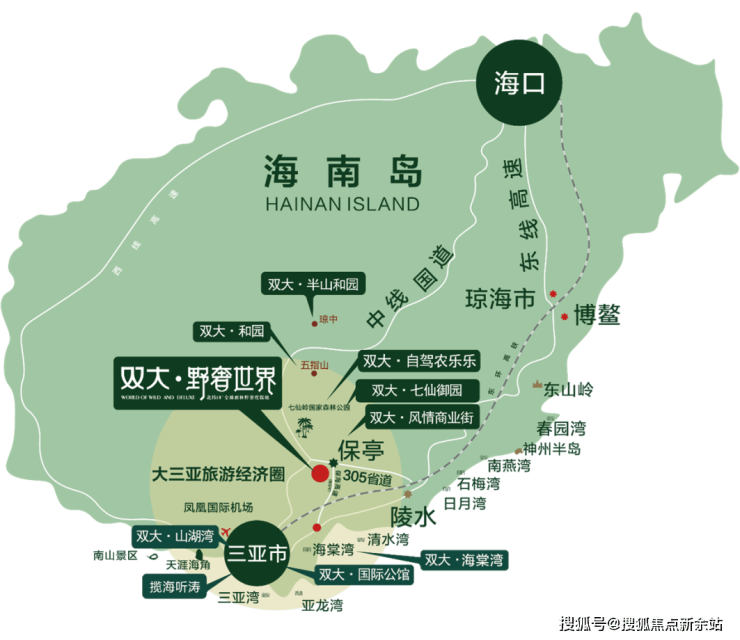 双大野奢世界项目坐落于海南岛中部核心城市保亭,距离三亚市东北方向76公里、驱车90分钟即可达。项目北靠五指山市约39公里,东临陵水40公里,南距海棠湾32公里。保海高速通车后15分钟即可到达国家海岸海棠湾。