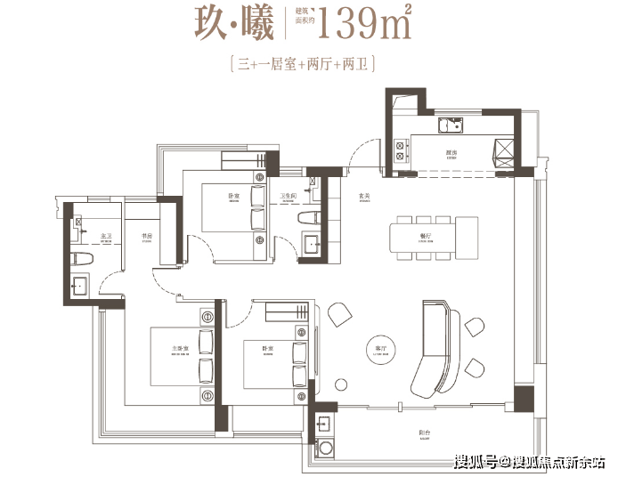 3栋A座为3梯4户塔楼,每户都有光厅,每户主卧都有270°无柱转角飘窗。本栋“约139㎡3+1房2卫户型”跟2栋户型有着一样的朝向和景观,算是平替之选。