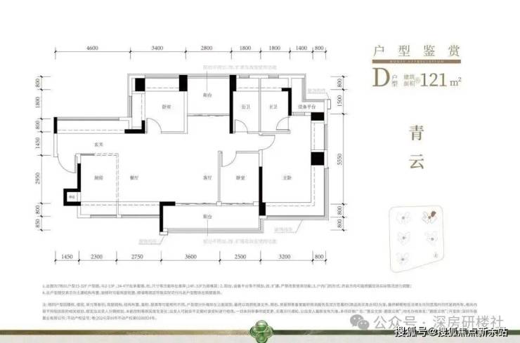 121㎡的4房2厅2卫,设计的是横厅南北通透格局,进门赠送约4.6㎡的入户玄关(不计算在户型图内),客餐厅6.35米开间,LDKB一体化设计,分别做到了主卧22.5㎡/次卧11.56m²/次卧9.52㎡/次卧7.38㎡(包含墙体飘窗),主卧带设备平台,L型厨房,卫生间干湿分离,得房率约106.49%(包含赠送),客厅连接次卧出6.1米长大阳台约9.76m²,东南朝向。飘窗赠送面积23m²+阳台赠送面积8.52m²+设备平台2.96m²=实际赠送面积约34.48m²。