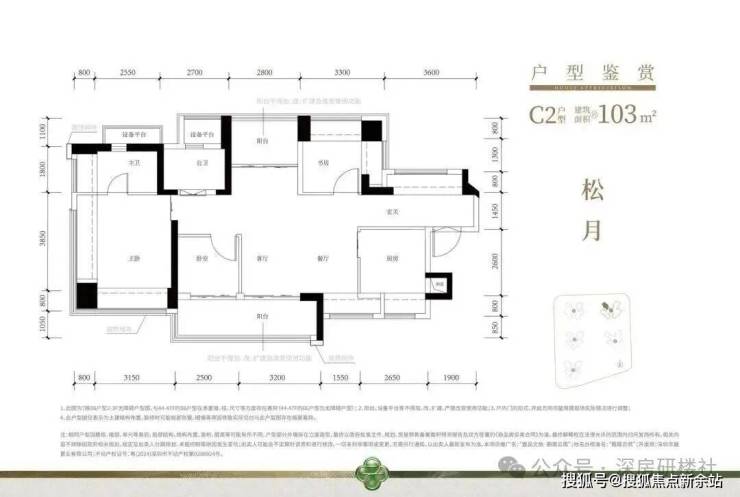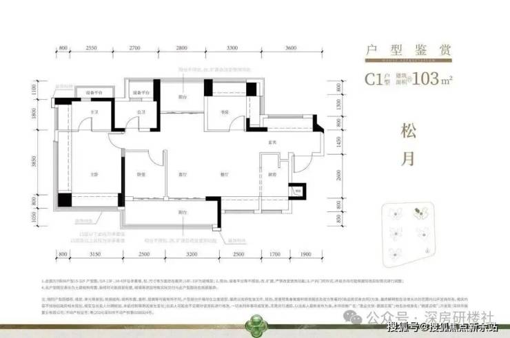 103㎡的4房2厅2卫,设计的是横厅南北通透格局,进门赠送约4㎡入户玄关,客餐厅5.7米开间,分别做到了主卧17.73㎡/次卧9.5㎡/次卧8.12㎡/次卧6.88㎡(包含墙体飘窗),主卧+1个次卧270°飘窗,U型厨房,卫生间干湿分离,得房率约106.3%(包含赠送),客厅连接次卧出5.7米长大阳台约9.4m²,西南朝向。飘窗赠送面积17.6m²+阳台赠送面积7.64m²+设备平台3.93m²=实际赠送面积约29.17m²。