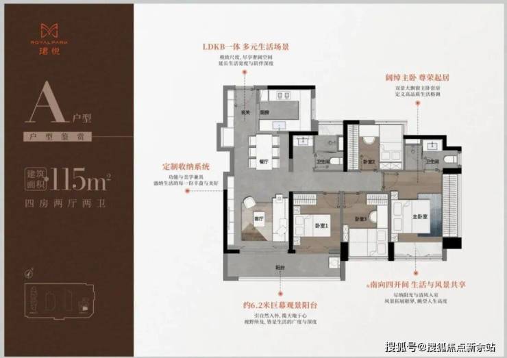 A户型:四开间朝南,6.2米巨幕阳台,奢阔尺度。