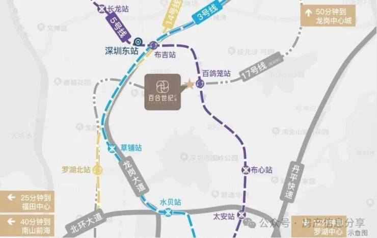 百合世纪广场,位于深圳市龙岗区布吉街道惠康路与翔鸽路交汇处,地处布吉核心板块百鸽笼片区,紧邻罗湖布心,是连接龙岗与罗湖的枢纽区域。项目北侧为万科红生活区,南侧毗邻荔山公园,直线1公里内覆盖求水山公园、围岭山公园等生态资源。