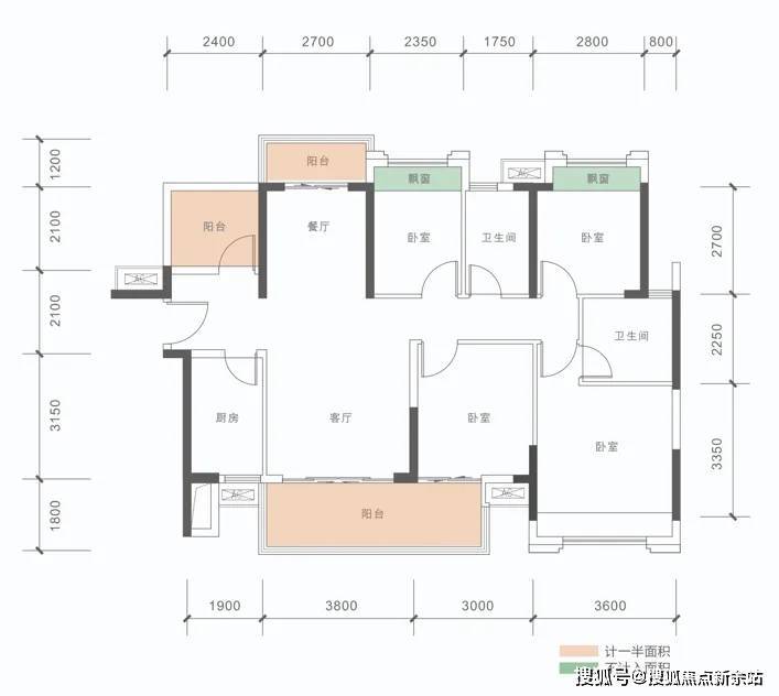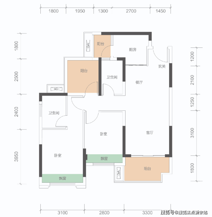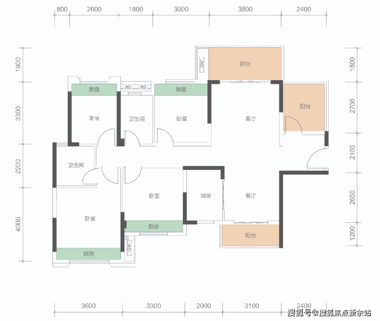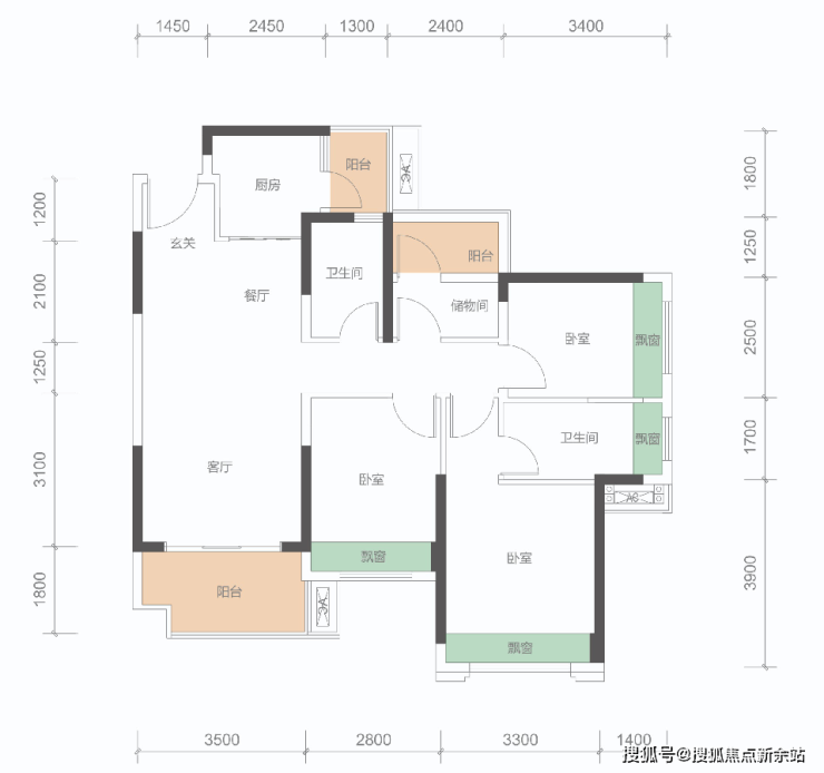 B户型: 100㎡(3+1房,2卫)同级面积稀缺3+1房、稀缺三开间朝南,