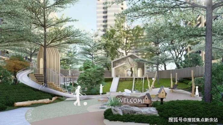 林荫儿童游戏场,采用生态材料布置圆木桩、森林穿梭、树屋主题器械等设施,丰富的植被体系、自然环保的砾石铺设,让孩子们能更安心舒适的在自然中协作与冒险。穿梭与林下,与自然相契合,多形态的灌木形式、自然堆叠的原木设施,建造一片承载着欢声笑语、释放天性的童趣世界。