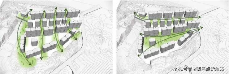 合生缦云·帝景山庄最大的设计难点在于场地的高差,用地高差最高点标高为65米,最低点标高为38米,高差为27米。设计充分利用地块的特性关系,根据地形变化的舒缓,分成了3阶台地空间,将居住空间形成组团形态,并形成了错落有序的天际线变化。