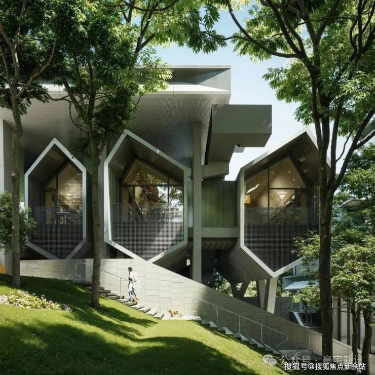 两个不同的会所,一静一动,容纳了健身游泳、图书阅览、聚会活动等不同的功能。双会所与架空层内丰富的社区商业共同构成城市生活型社区。