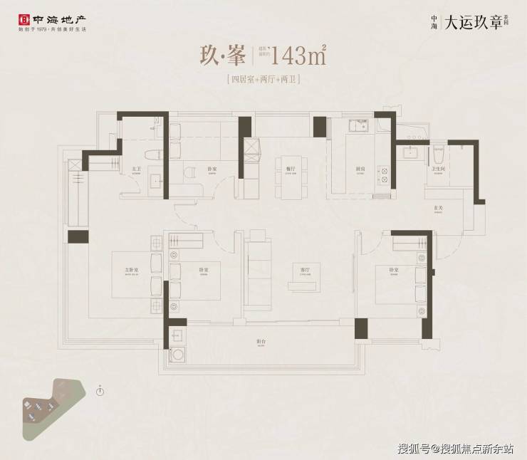 户型面积布局143平四房两厅两卫设计的是竖厅南北通透格局,进门入户玄关,客厅4.5米开间,餐客厅分离设计,四开间朝南,全屋七面飘窗,主卧大套间做到了270度转角无柱飘窗,U型厨房,公卫三段式干湿分离,得房率约92.2%(包含赠送),客厅连接次卧出7.4米长的观景大阳台,全部主朝东南向,看大运中心+大运公园景观。户型亮点市场上最畅销的南北通透的竖厅户型,保留了2开间阳台,L型长飘窗主卧保证得房率之外,这里设置了进门的独立玄关+卫生间的组合,符合新一代的健康户型概念。