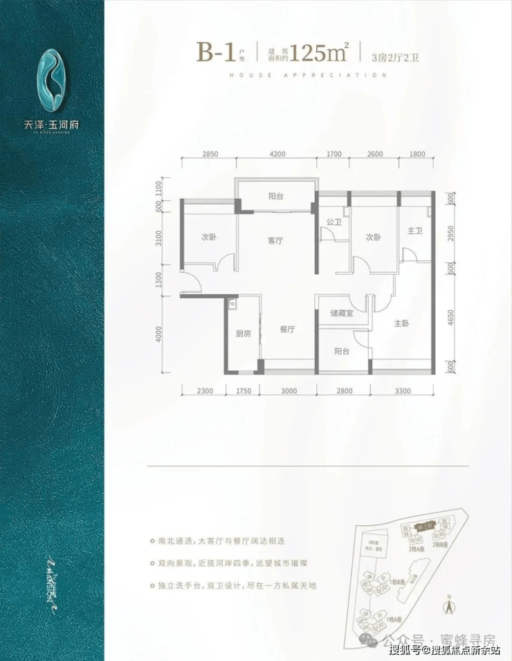 B1户型-125㎡-4房2厅2卫,设计的是竖厅南北通透格局,客厅4.2米开间,全屋飘窗设计,4个房间宽度分别为3.3/2.85/2.8/2.6米,L型厨房,得房率:91.1%(包含赠送),阳台进深1.7米,主朝西北朝向。