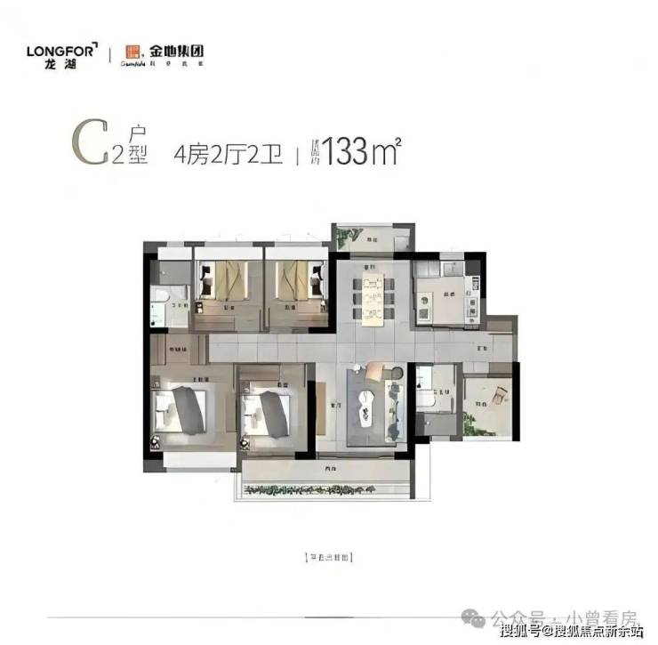 像 133㎡的 4 + 1 房,四开间朝南,南北双阳台对流,还有中西厨岛台,约 6.7 米超大阳台,主卧有步入式衣柜。