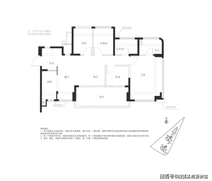横厅设计,入户玄关处可以做收纳,全屋多飘窗,主卧套房设计,“阳台”和“书房”处实际可以做房间。