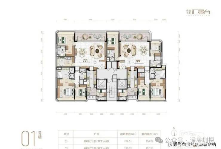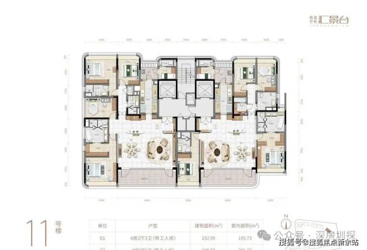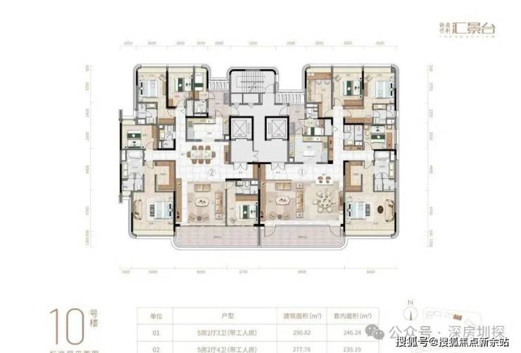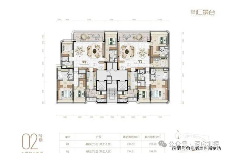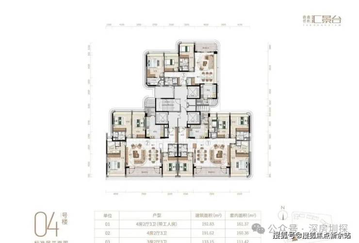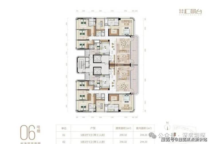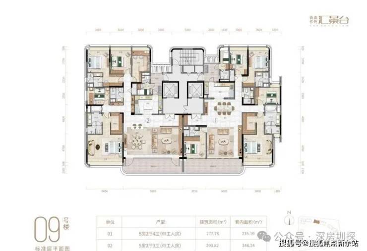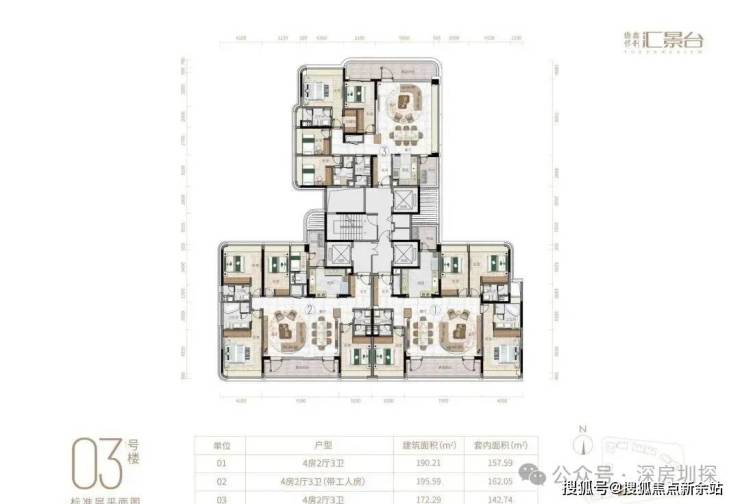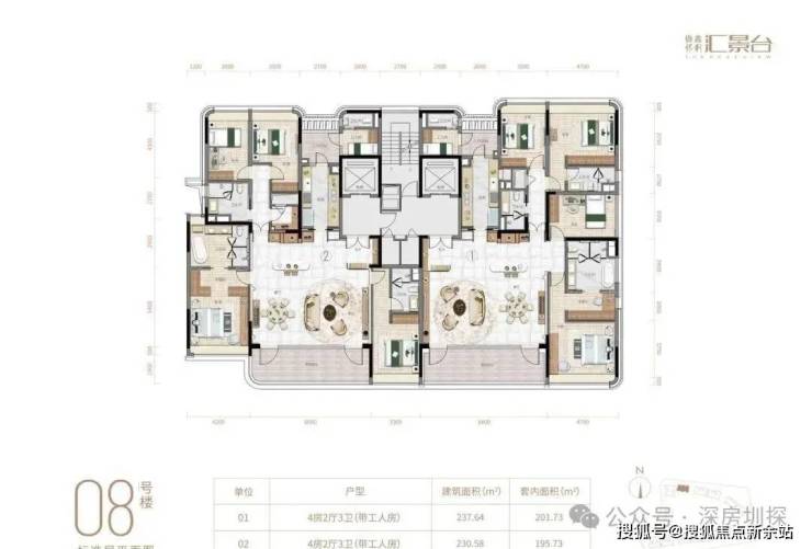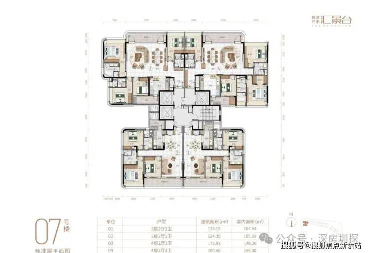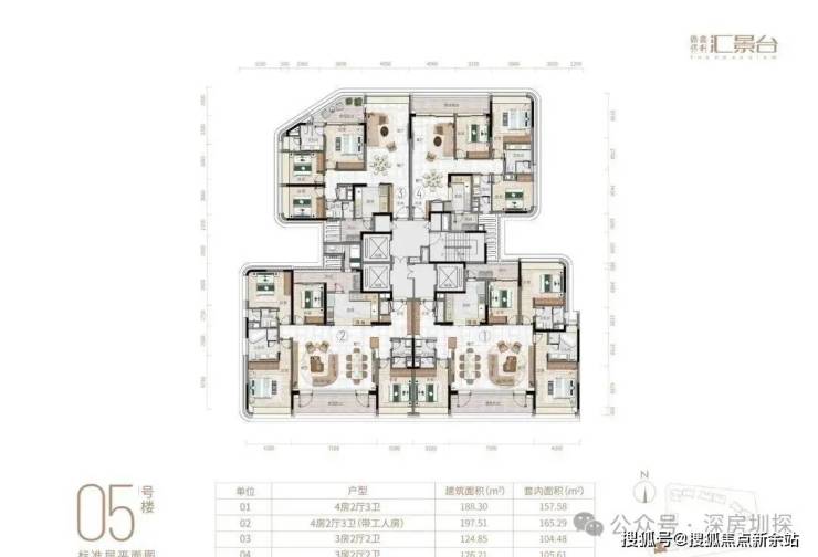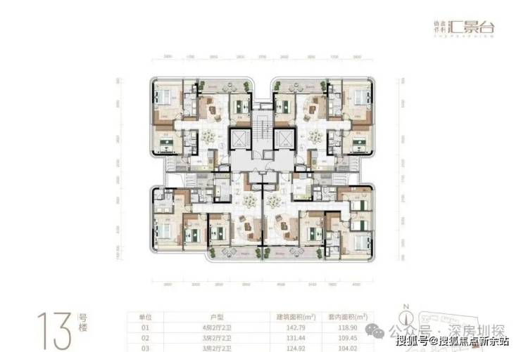 项目由14栋12层小高层组成,产品涵盖123-352㎡三至五房,共8类户型,户型实用率约82-84%