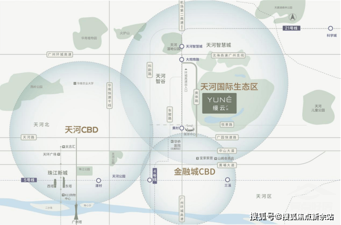 合生缦云坐落于天河奥体板块,处于城市半小时生活圈,与天河 CBD、金融城 CBD 直线距离约 6 公里,尽享都市繁华。