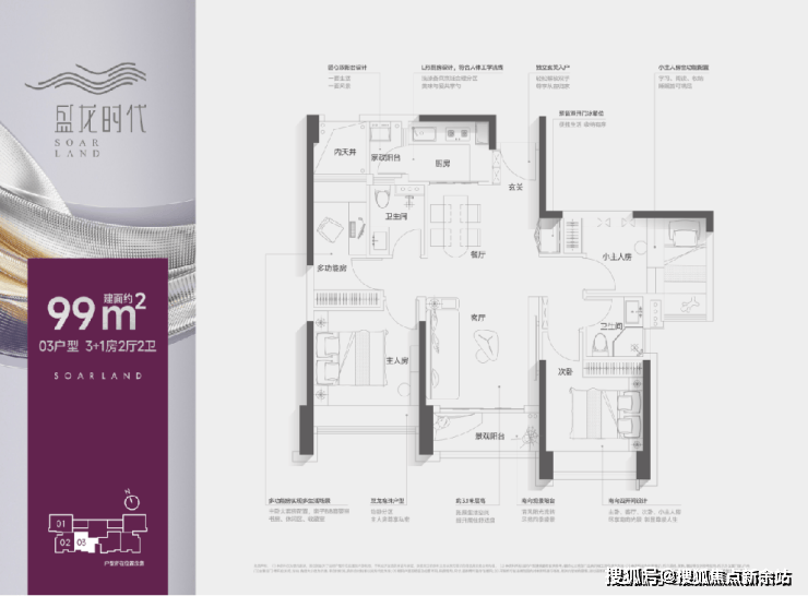 【盛龙时代】定位是面向城市精英的乐活、时尚的精品社区。可售房源仅约110套。本次推售的是市场臻稀的创新产品:约99㎡3+1房2卫,以及约95㎡三房2卫