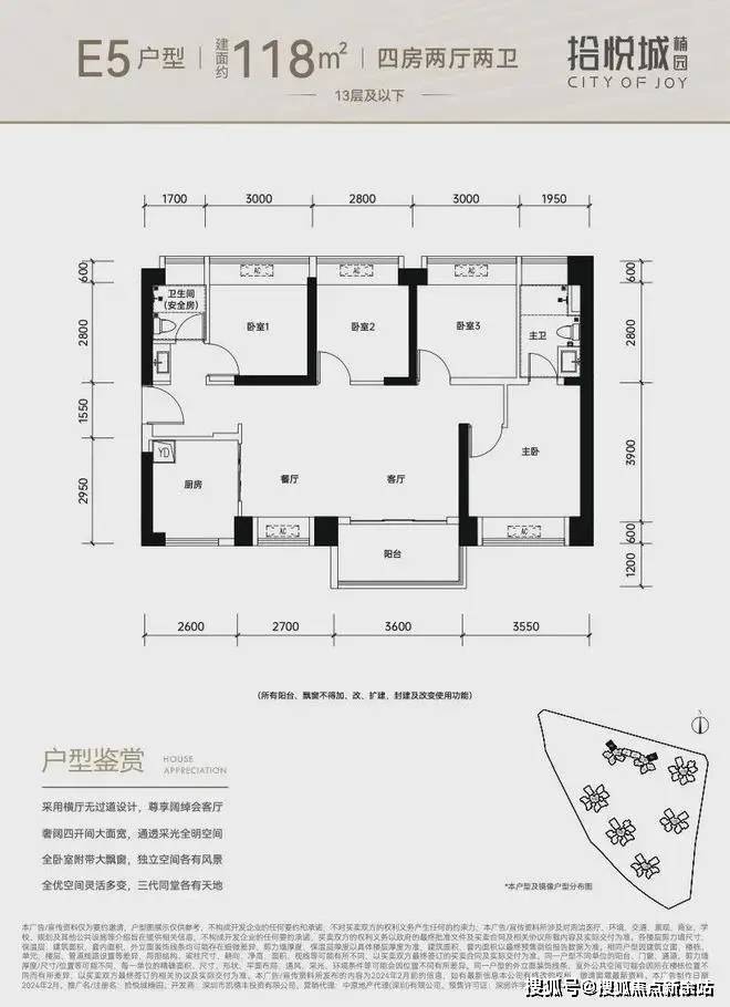 115平~118平全明采光户型,四卧室、厨房、两卫、客餐厅等均设计超大采光面,带来明亮通透的舒适居感,客餐厅以横厅布局,让家庭居住空间的视野范围和活动区域扩大,加强家庭成员之间的情感交流;不论是三代同堂的天伦之乐,亦或是四口之家的温馨时刻,皆能一步到位。