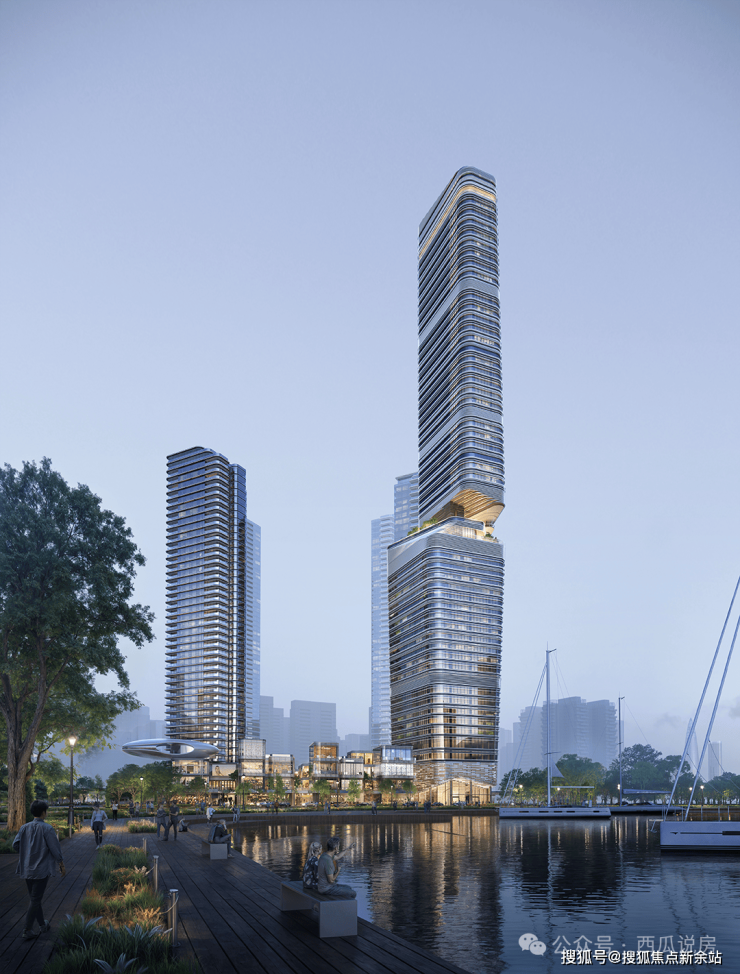 在建筑单体设计上,通过高达12米的架空层,确保首层住户即位于约20米的观海高度,实现“户户观海”。单侧布局核心筒的布局方式也最大限度地拓宽了住户的景观界面。地标塔楼高度达250米,住宅塔楼则在161米至192米之间高低错落,共同勾勒出和谐灵动的城市轮廓。