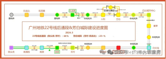 22 号线建设中,二期在建完成68%,开通后可直达白云机场,出行办公旅游都比较方便;
