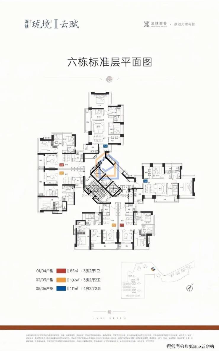 深铁珑境开发主体为深圳市地铁集团有限公司,项目位于深圳市龙华区大浪街道布龙路与龙华和平路交汇处西北侧,归属上塘板块,临近深圳地铁 4 号线龙胜站,周边配套成熟度较高,项目总占地面积约 11.05 万㎡,总建筑面积约 48.3 万㎡,计容建筑面积约 36.01 万㎡,容积率 2.92,绿化率 30.01%,整体分 3 期开发建设,业态涵盖住宅、九年制学校、幼儿园及社区公共配套设施;其中一期为地铁盖上物业,业态包含小高层、洋房住宅,同步配建九年制学校、幼儿园及其他社区公共配套,目前已全部建成并完成交付;二期总建筑面积约 21.31 万㎡,计容建筑面积约 9.59 万㎡,由 3 栋 51-55 层的超高层住宅组成,具体为总高 52 层的 4 栋商品住宅、总高 51 层的 5 栋人才住房、总高 55 层的 6 栋商品住宅,为项目当前主力在售组团,主力户型为建面约 85-111㎡的三至四房住宅产品;三期总建筑面积约 14.03 万㎡,规划建设 5 栋 49-55 层的超高层商品住宅,无人才住房配建,具体为规划总高 55 层的 7 栋、9 栋、10 栋商品住宅,规划总高 49 层的 8 栋、11 栋商品住宅,目前处于待售状态;项目全盘规划总户数 2582 户,其中商品住宅 2246 户,人才住房 336 户,二三期超高层住宅均采用 3 梯 6 户的梯户设计,整体规划机动车停车位 2453 个,户均车位配比约 1:0.9。