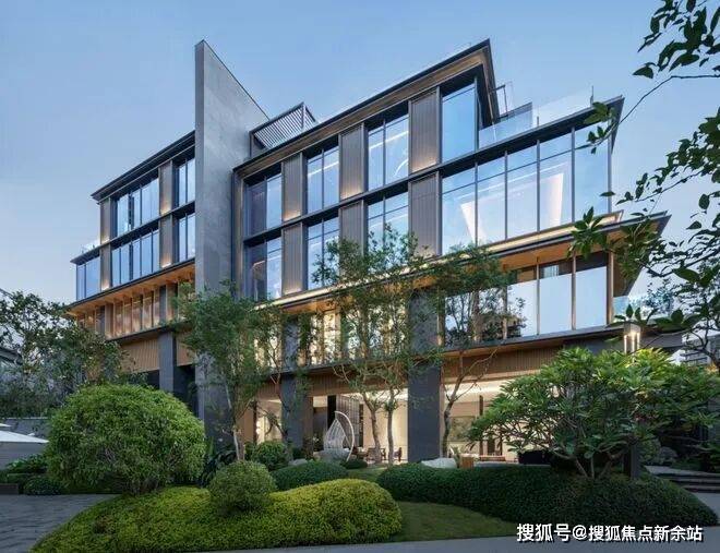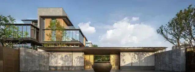 国际顶流审美的公建化外立面,遥遥望去,两三层的墅院都隐身在湖光山色之中,只露出剔透的落地窗,和向天空伸展的大露台。