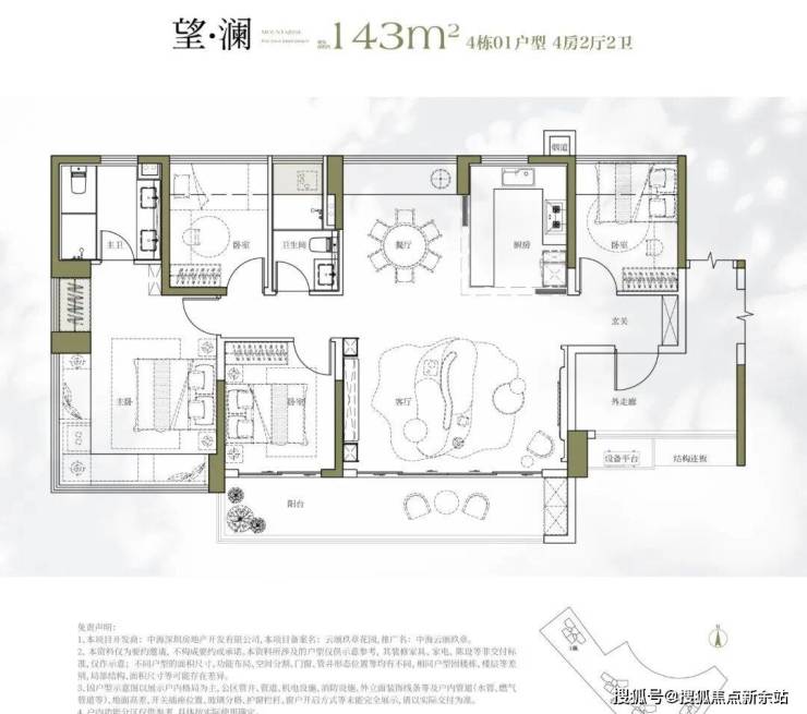 143㎡四房两卫:终极改善,大横厅 + 宽景阳台,主卧 270° 飘窗 + 独立卫浴 + 衣帽间,四分离卫浴,尺度奢阔,总价 980-1100 万。