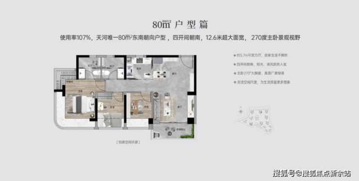 建面约100㎡ | 三房两厅两卫(B户型),独立入户玄关,多面宽朝南,约5.9m百变宽厅,主卧270°弧形飘窗。