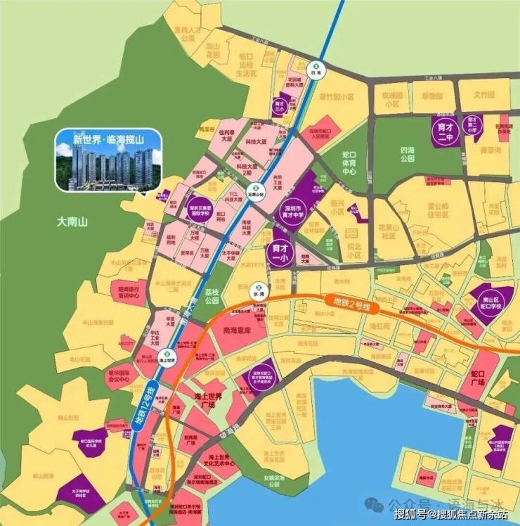.新世界临海揽山御园位于南山蛇口工业五路与沿山路交会处,占地面积近4万㎡,总建筑面积约30万㎡。